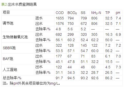 由于豬場沼液的碳氮比低,可生化性差,不適合微生物生長,故定時向廢水中添加一定量的營養物,以提高B/C。系統運行至今,各單元處理效果穩定,經生物接觸氧化、SBBR、BAF、人工濕地處理后,出水水質可滿足《畜禽養殖業污染物排放標準》(GB 18596—2001)中的相關要求,監測結果見表2。