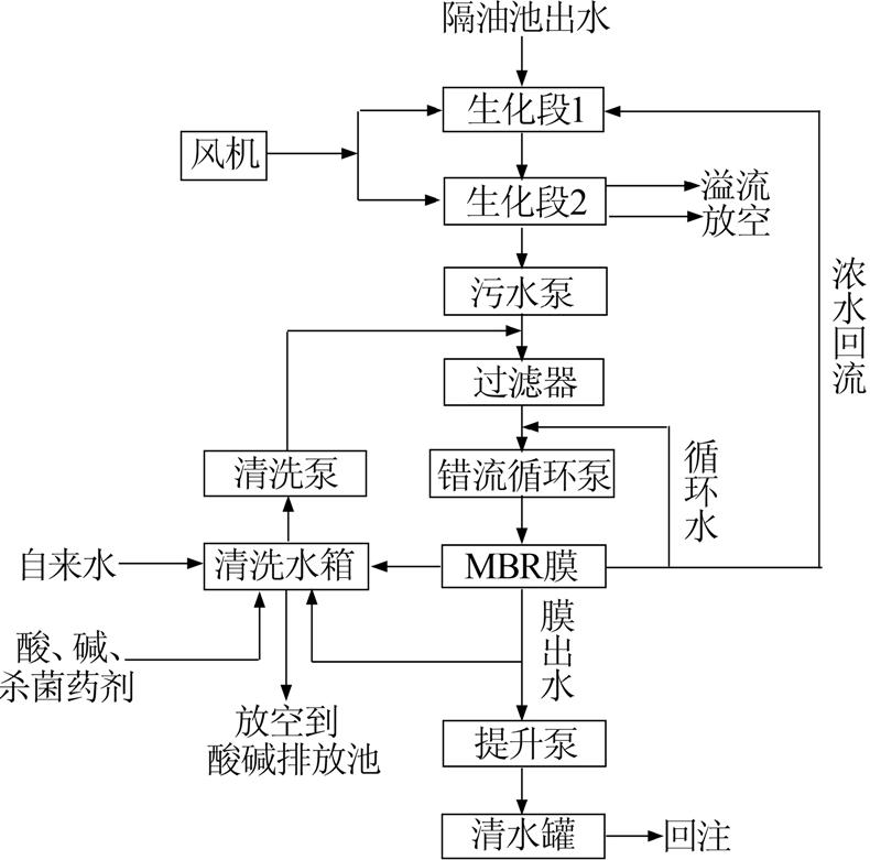 在充分調研基礎上形成的水處理工藝設計方案,有效地解決了設備體積小、含油廢水處理難度高的技術難點,在保證出水指標的基礎上,合理利用有效空間,形成了生化處理+膜處理的獨特處理工藝。經處理后,管式膜出水油≤5 mg/L,懸浮物粒徑中值0.5 μm,SS 0.7 mg/L,SBR為0。