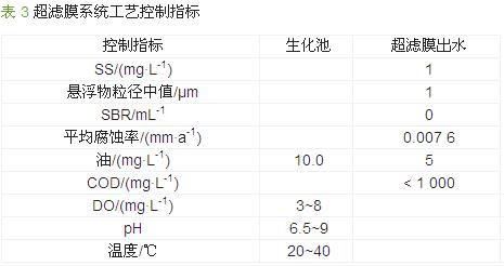 超濾膜采用德國BERGHOF膜組件,膜道8 mm,膜孔30 nm。經生化處理后的含油廢水由進水泵打入超濾膜系統,膜系統產水經轉子流量計計量后排入凈水罐,部分濃水回流至生化系統,部分濃水由循環泵與進水混合重新進入超濾膜〔7〕。超濾膜處理系統流程見圖 3。工藝控制指標見表 3。