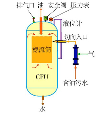 CFU工作原理如圖 1所示。采出水主體水流先經自制的微氣泡發生器注入大量的微氣泡,然后沿切向入口進入浮選罐,在罐壁與內部穩流筒之間形成的環形空間內產生旋流,旋流引起的離心力場驅使氣泡與油滴**黏附,黏附氣泡后的油滴與水的密度差進一步加大,進而加速浮升,提高了油水分離效率,實現對生產水的**處理,同時大大縮短水力停留時間,減小了處理設備的尺寸。其中,自行研制的微氣泡發生器利用微孔發泡機理,通過微孔對氣流進行連續剪切后經水流沖刷而形成微氣泡,有效規避了常規氣泡發生方式能耗高、產生氣泡性能差、剪切乳化程度高等不足〔4, 5, 6〕,微氣泡發生器的優越性能也為CFU除油效率的提高提供了保障