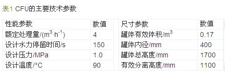 CFU的浮選罐外形尺寸為D 0.4 m×1.7 m,微氣泡發生器外形尺寸為D 76 mm×700 mm。現場試驗時CFU采用2個立式氣浮罐串聯成撬,總體尺寸為1 430 mm×1 200 mm×2 370 mm,凈重≤1.5 t。其他參數如表 1所示。