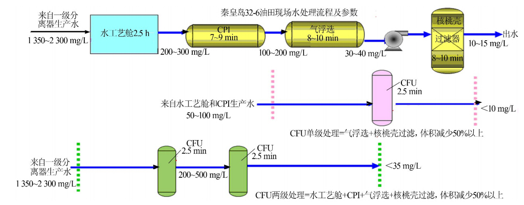 由圖5可以看出,單級CFU在入口含油50~100 mg/L、水力停留時間2.5 min時的處理效果與現場應用氣浮選+核桃殼過濾相當,設備體積可減少50%以上;采用兩級CFU串聯,在入口含油1 350~ 2 300 mg/L、總水力停留時間為5 min時的處理效果與現場應用水工藝艙+斜板除油器+氣浮選+核桃殼過濾的效果相當,設備體積可減少50%以上。顯然,采用CFU可以減少水處理設施的串聯級數或大大減小設備體積,這對于海上油田而言極具應用優勢。