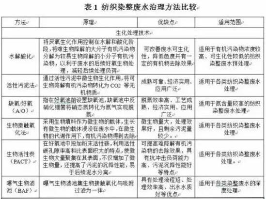 預處理技術采用格柵、中和、水質水量調節和氣浮等;生物處理采用水解與好氧結合的處理工藝,好氧處理技術采用活性污泥法、生物接觸氧化技術、生物活性碳(PACT)和曝氣生物濾池(BAF)技術等;物理化學處理采用混凝沉淀、砂濾技術和膜分離技術等。各種方法的主要優缺點見表1。